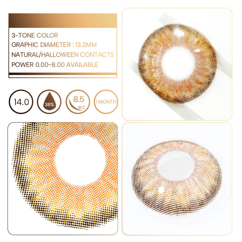 Achieve a stunning, natural eye-enhancing effect with our 3-tone brown contact lenses, designed with irregular dot patterns to mimic the authentic texture of a real human iris. Perfect for both daily wear and Halloween costumes, these lenses provide a subtle yet dramatic look with a 13.2mm graphic diameter for seamless coverage.